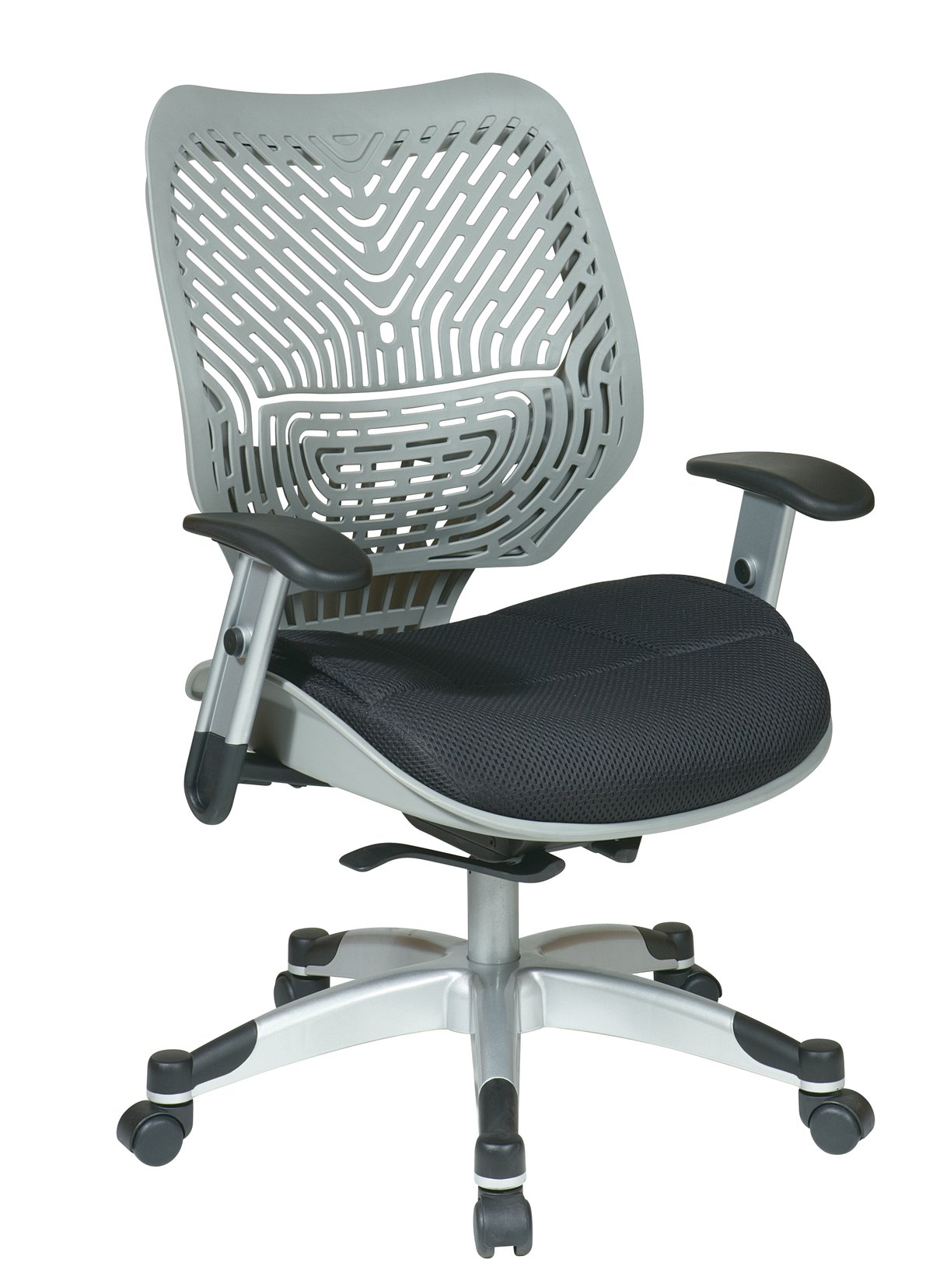Unsurpassed up-to-the-minute ergonomic design arrives in the form of the Revv Series SpaceFlex Back Chair with Self Adjusting Mechanism. Intelligently outfitted with a firm yet flexible cut out style contoured back, the backrest of this ingenuitive seating solution provides for optimal support while sporting cutting edge style. Brilliantly constructed with a thickly padded 2-layer mesh seat and engineered with pressurized seat height adjustment, the easily adjustable seat wicks away moisture and allows for quick and simple seat positioning. The genius tilt tension function allows you to recline with perfect balance and support while also providing an anti-kickback functionality when arising from a seated position. Height adjustable padded arms allow for a place to rest your hardworking hands and a heavy duty fully finished base with end caps and dual wheel carpet casters allow you to glide effortlessly while protecting the base from scuffs and scratches. Combine all these features with the eco-friendly GreenGuard certification and you have a perfect work chair that is destined to be the office favorite for years to come.